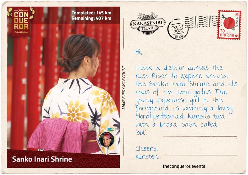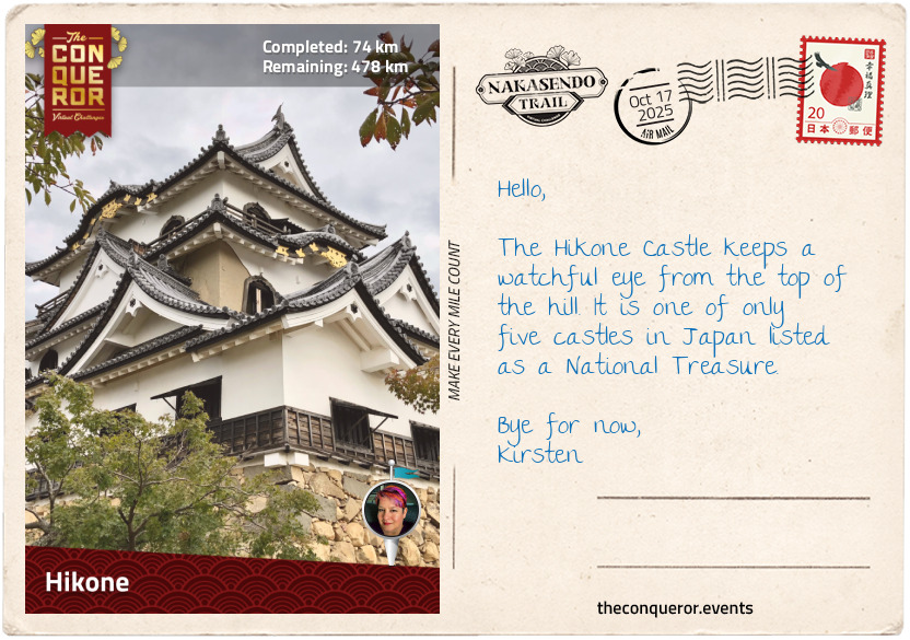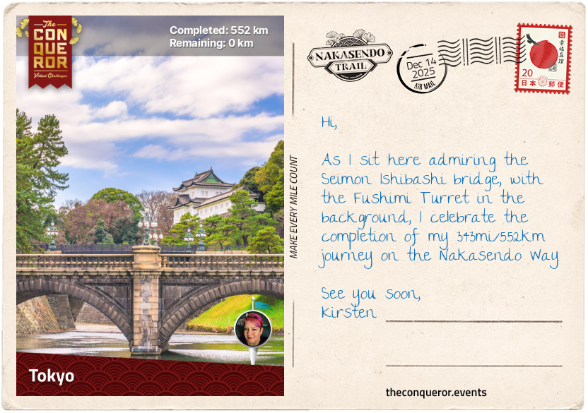 And that, dear folks, is half of the story of how I chose the Nakasendo Trail Virtual Challenge. It is 552 kilometres (343 miles) long, which ought to take me a bunch of months to finish at my new and improved plodding speed of around 7 kilometres a day. The content of the challenge mattered, too, not just the distance. The challenge goes from the old capital Kyoto through 69 post-towns and finishes in Tokyo. Along this virtual route, I will pass through bamboo forests, hot spring waters, charming settlements, castles, cobblestone streets and rural life in real Japan. This is not unlike the Japanese vacation I have wanted to take for upwards of 30 years now.