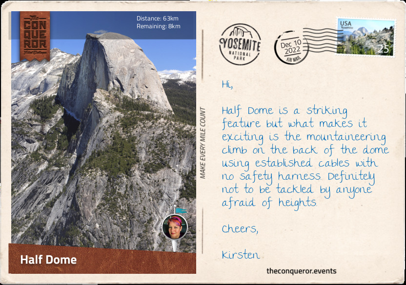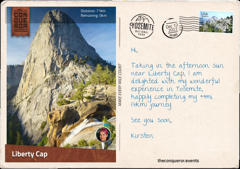 The Yosemite National Park Virtual Challenge takes you on a 44mi (70km) route from Nevada Falls to Liberty Cap through the famous steep granite valley walls, giant sequoia groves, gushing waterfalls, and hiking trails. I have to admit, moving the pegman around on the app is awful pretty for this challenge.